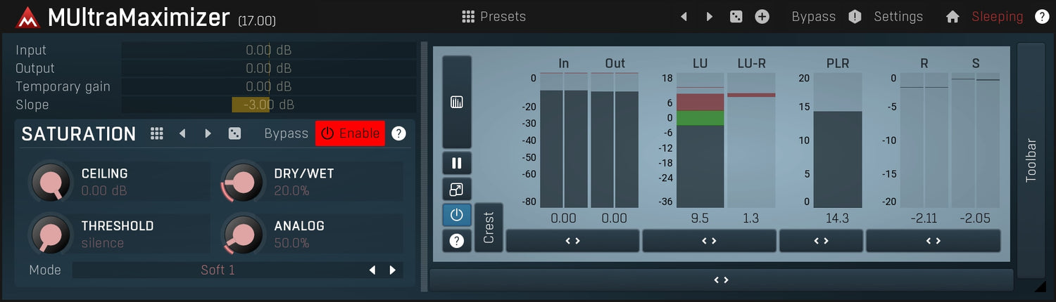 MUltraMaximizer cuenta con nuestro magnífico sistema de saturación, que puede añadir un carácter analógico agradable a tu música y aumentar la sonoridad.