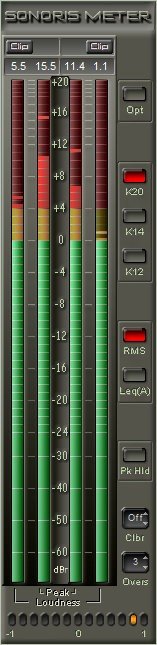 With the Sonoris Meter, you can measure peak and loudness levels of audio signals, simultaneously at one scale. Besides a regular meter scale the Sonoris Meter supports the K-System, from Bob Katz, mastering engineer and founder of Digido masteringstudio. The end product closely follows the K-system specifications, including Leq(A) loudness metering and bandlimited pink noise monitor calibration.