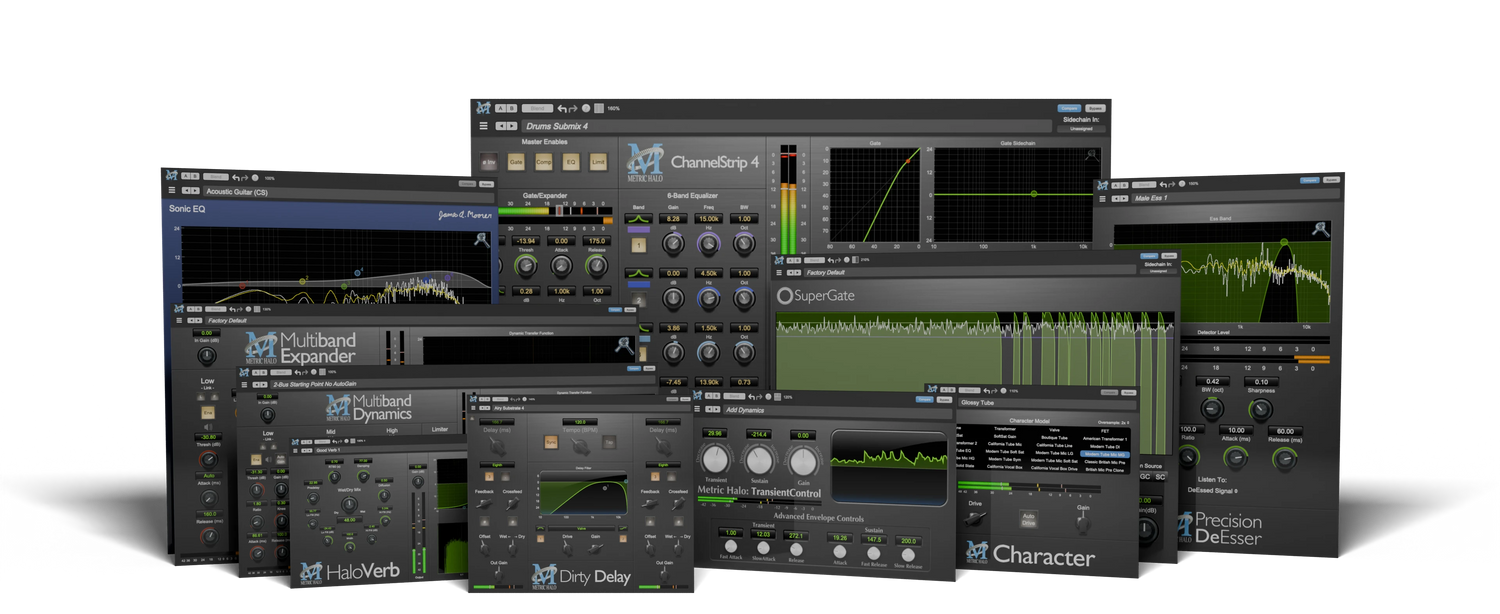 MH Production Bundle v4 Se Trata del Sonido... El Metric Halo Production Bundle: ¡El conjunto de herramientas esencial utilizado por ingenieros galardonados con el Grammy® y creadores de éxitos número 1 en todo el mundo! El MH Production Bundle v4 es un conjunto de plug-ins de procesamiento de señales que te permite dejar de grabar y comenzar a hacer discos. Con todas las herramientas críticas que necesitas para dar forma, domar, manipular y masterizar tus pistas, es el conjunto de herramientas de ingeniería de audio esencial que nadie debería estar sin. El Production Bundle incluye 10 plugins de sonido fantástico que te ayudarán a llevar tu trabajo a nuevos niveles: MH ChannelStrip v4, MH Character v4, MH DirtyDelay v4, MH HaloVerb v4, MH MultibandDynamics v4, MH MultibandExpander v4, MH Precision DeEsser v4, MH TransientControl v4, MH Sonic EQ v4, y MH SuperGate v4. Los mejores ingenieros, productores y músicos del negocio utilizan Metric Halo. Pruébalo Gratis por 30 Días Queremos que escuches cómo Metric Halo puede llevar tus mezclas al siguiente nivel – por eso tenemos una prueba gratuita y completamente funcional de 30 días de todos los plugins del Production Bundle incluidos en la Prueba del Production Bundle. ¡Prueba todos los plugins del Production Bundle por ti mismo hoy! https://www.mhsecure.com/products/software/MHProductionBundle_v4.html