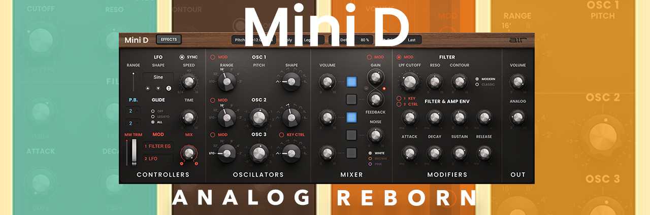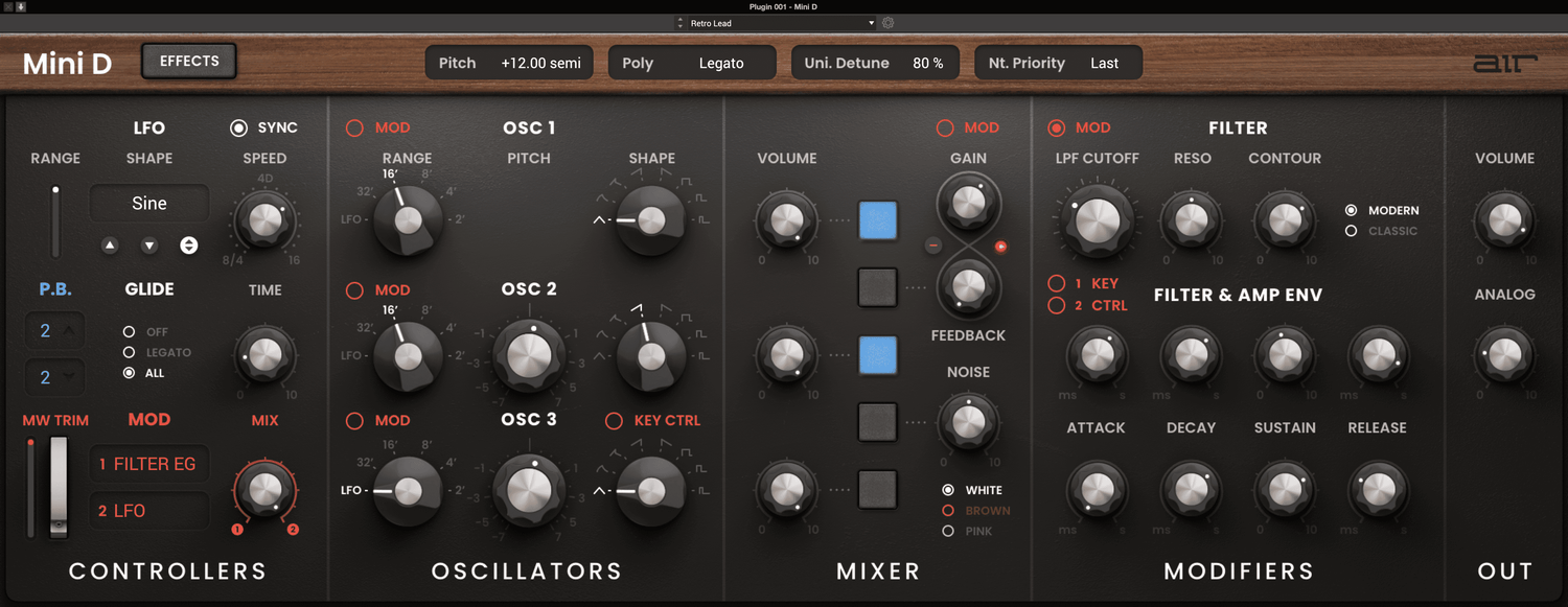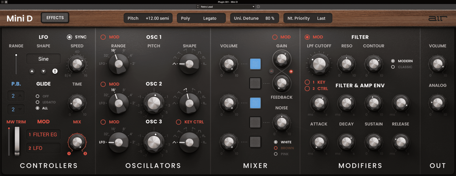 Built by the world-renowned Air Music team in Germany, the pre-sets in Mini D will inspire you! With over ten categories ranging from Bass to leads to Synth FX, you will surely find sounds that can be used immediately in your next track or great starting points for experimenting and customizing your own tones.