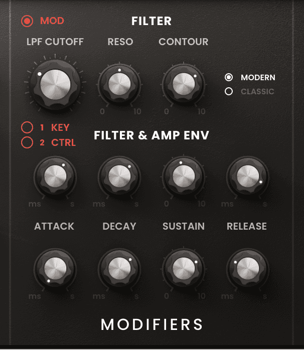 Mini D includes the “Classic” ladder style filter model with painstaking attention paid to the feedback section to create a truly remarkable emulation of the original. The filter can be tied to a key start or a second mod control source for sounds that morph and sweep over time, creating instant energy in your sound. In addition to the Ladder filter, Mini D synth also includes a “modern” style filter that emulates the more recent style of feedback filters to give your synth sound a more modern vibe.