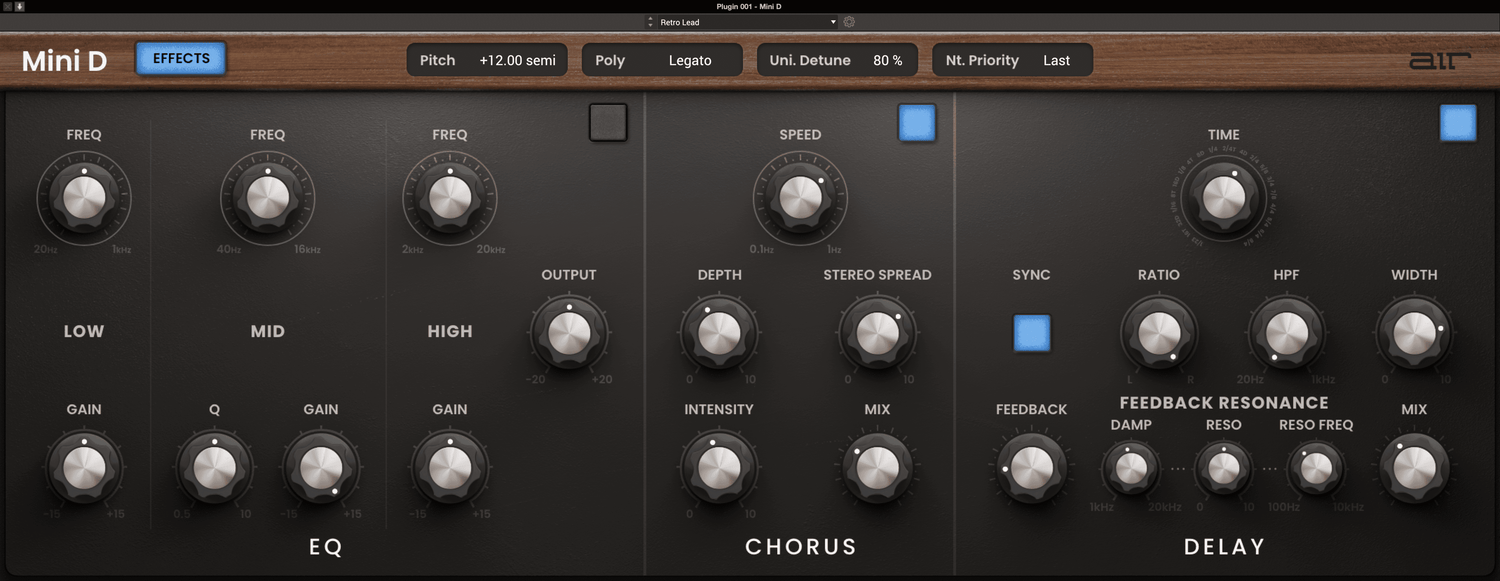 Unlike the original, the Mini D comes with three effects already on the end of the signal chain, perfect for adding color to your sounds without the need of outboard gear or using additional effects after the plugin. EQ with Low/Mid/High bands and gain control Stereo chorus effects to widen the sound with spread and mix controls Delay with tempo sync, high pass, stereo width, feedback and more