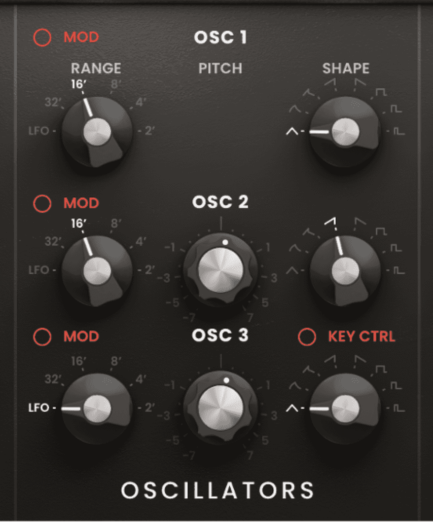 With 8 authentically modeled oscillator shapes, the Mini D synth is a powerhouse of rich, vibrant tone. Stack three oscillators per voice (Max of 4 Voices) with pitch detune on voices 2 and 3 to make massive pads, drone basses, or searing leads. Each Oscillator can be devoted as a mod source and includes traditional wave pitch ranges from 32'-2'.
