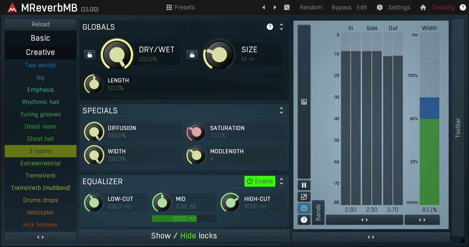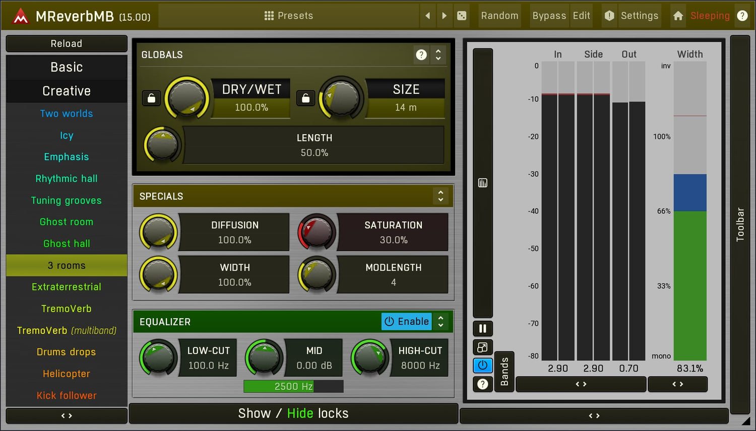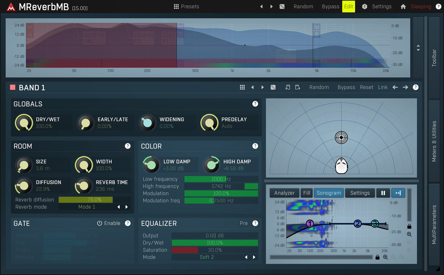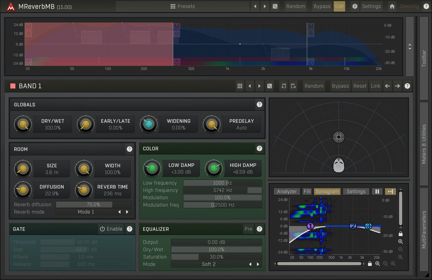 MReverbMB extends the possibilities well beyond that of standard quality reverbs by allowing you to process up to 6 distinct bands simultaneously. This reverb plugin can provide everything from extremely realistic halls to unbelievable effects.
