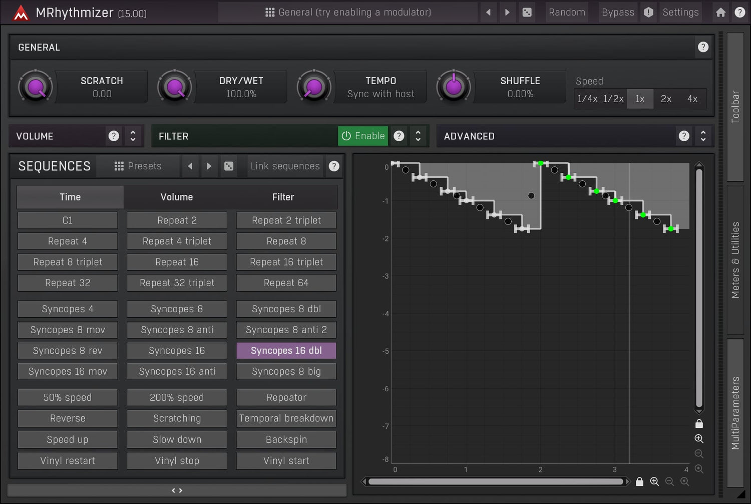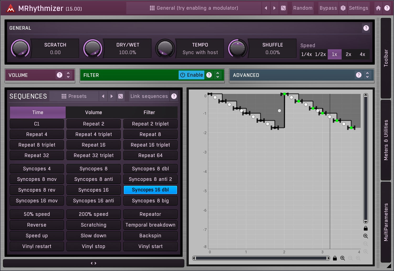From gating to glitching, repeating to scratching, all with stunning audio quality, that's MRhythmizer, a unique time manipulation effect that uses an integrated sequencer to control time, volume and filters. MRhythmizer brings your music to life, say goodbye to boring audio performances!