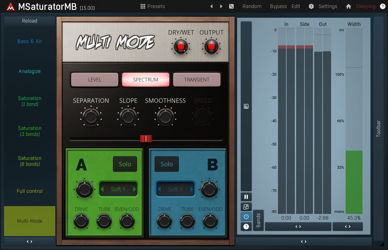 Saturation is a very special type of smooth distortion known from tubes and tapes. It can provide some harmonic flavour, improve bass and sub-bass content and much more. MSaturatorMB is an extremely musical and versatile saturation plugin, which also contains a digital harmonic generator. MSaturatorMB combines the best from both the analogue and digital worlds.