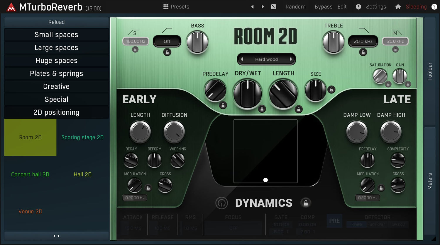 Each of these reverbs feature all the necessary controls such as dry/wet or reverb length, but also more special ones, such as a dynamics section or side high-pass filter. Switching between the reverbs is one click away, which tremendously speeds up your creative workflow.