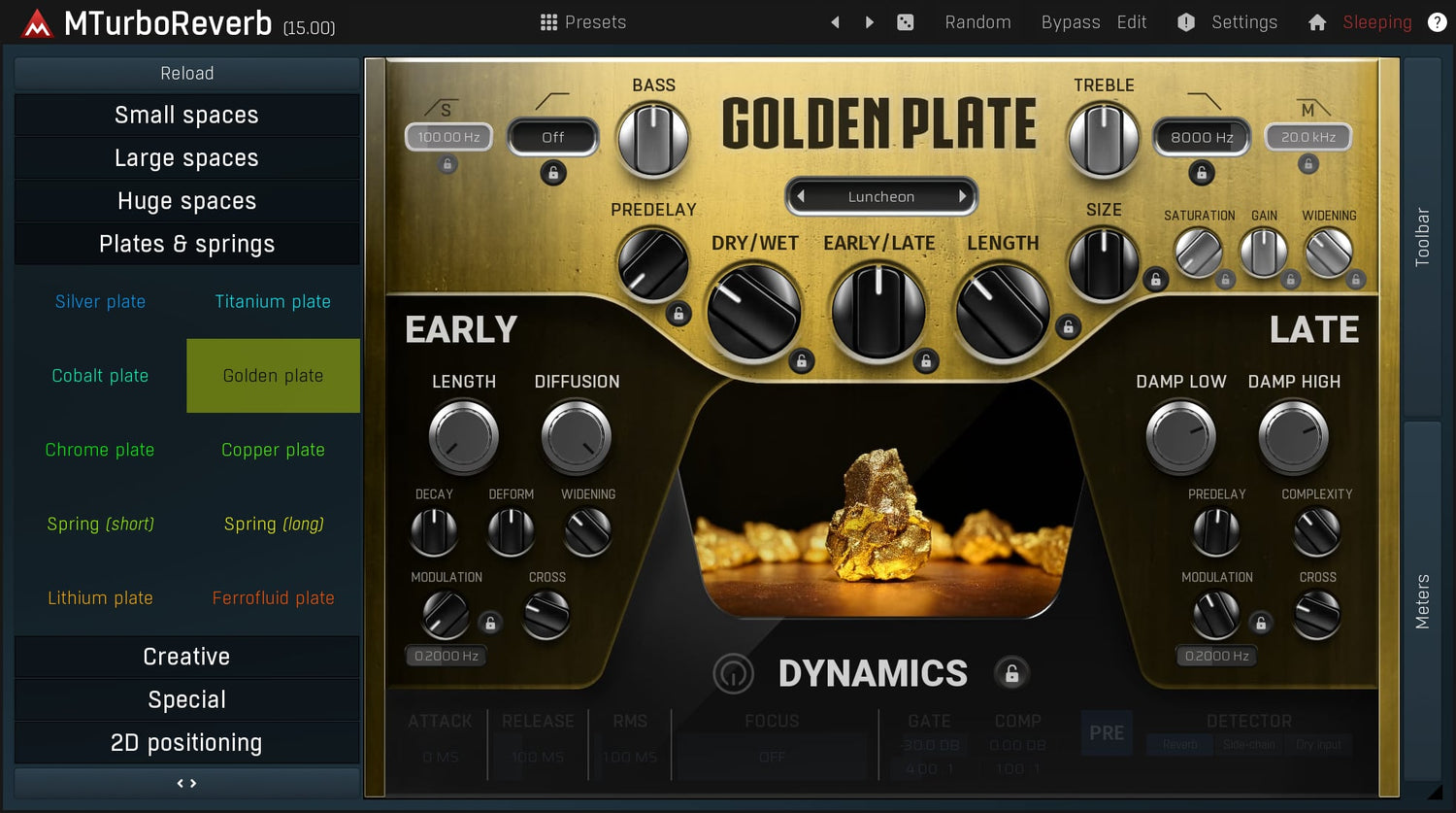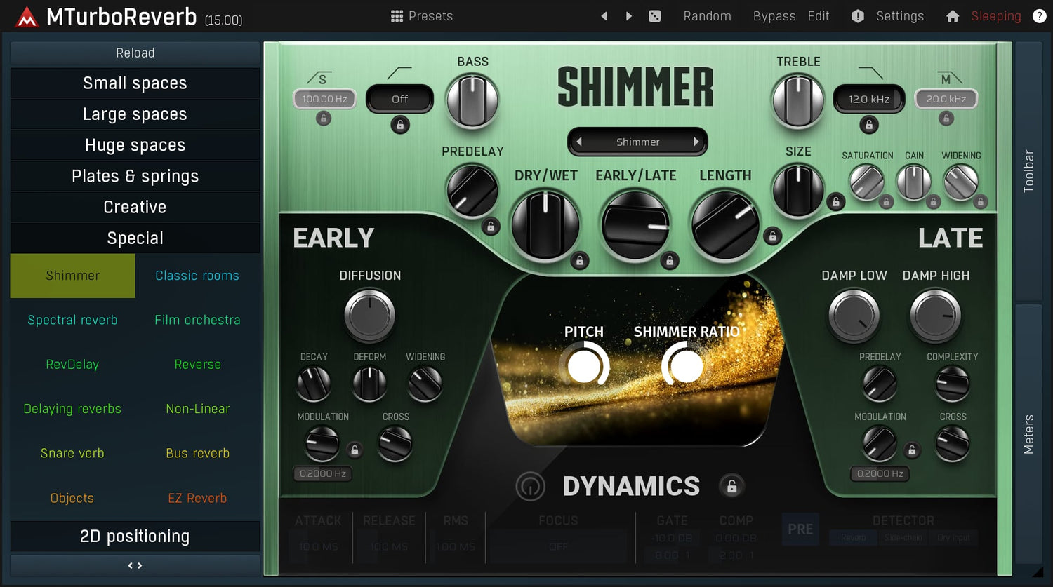 Algorithmic reverbs are usually based on a single algorithm. But MTurboReverb comes up with a revolutionary programmable engine, where you can design your own algorithms, but most importantly about 100 of them have already been prepared for you, with a standardized GUI for extremely quick workflow and short learning curve. There is everything from rooms to halls, plates, ethereal and shimmering sounds, and 2D positioning reverbs.