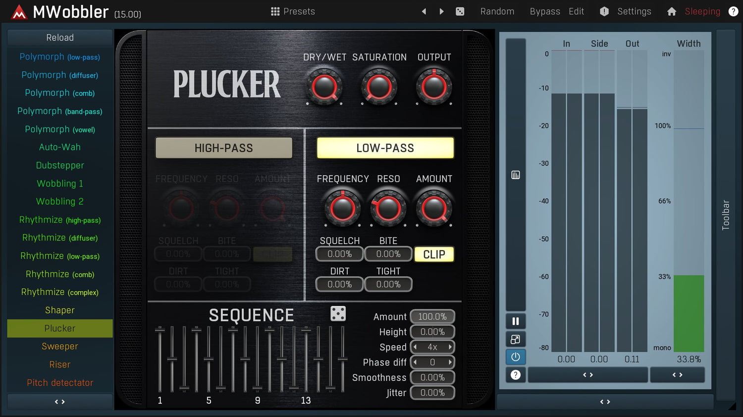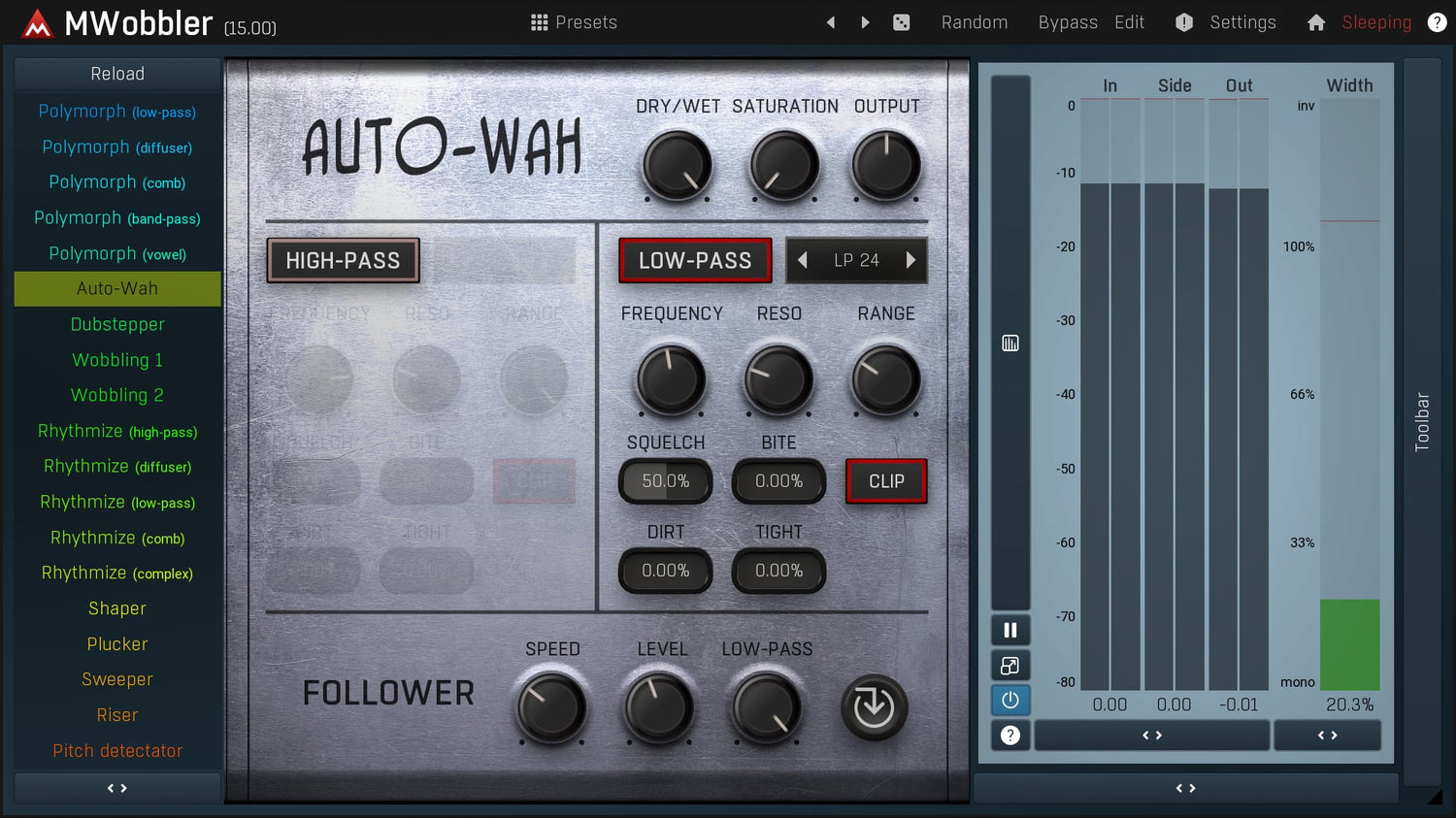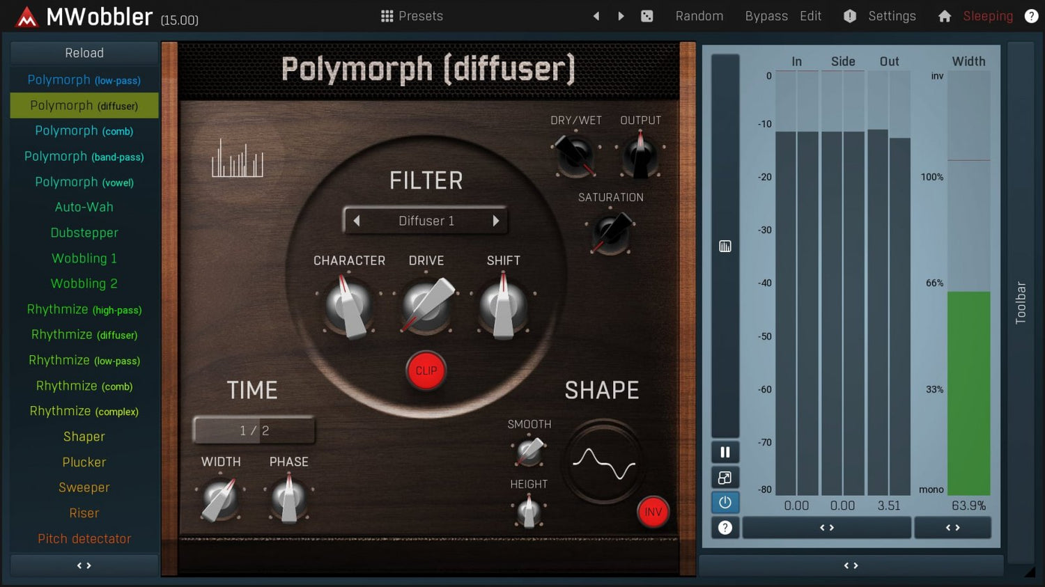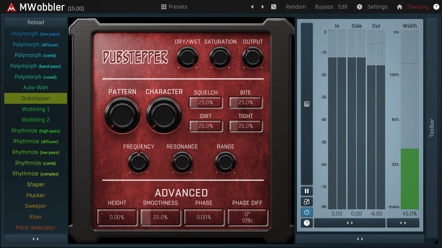 MWobbler is a unique distorting filter originally designed to produce dubstep wobbling basses, but it turns out to be a great multipurpose filter for just about any audio material from rhythmic pads, rotary organs to drum-driven basses...