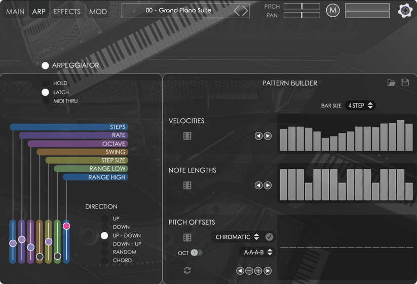 - Fully customizable Arpeggiator with Hold, Latch, and Midi Thru modes. Adjustable parameters include: Step Number, Rate, Number of octaves, Swing amount, Step Size, Keyboard split range Hi / Lo, 6 Arp patterns (up, down, up-down, down-up, random, chord), Velocity map, Note Length map, Pitch offset map