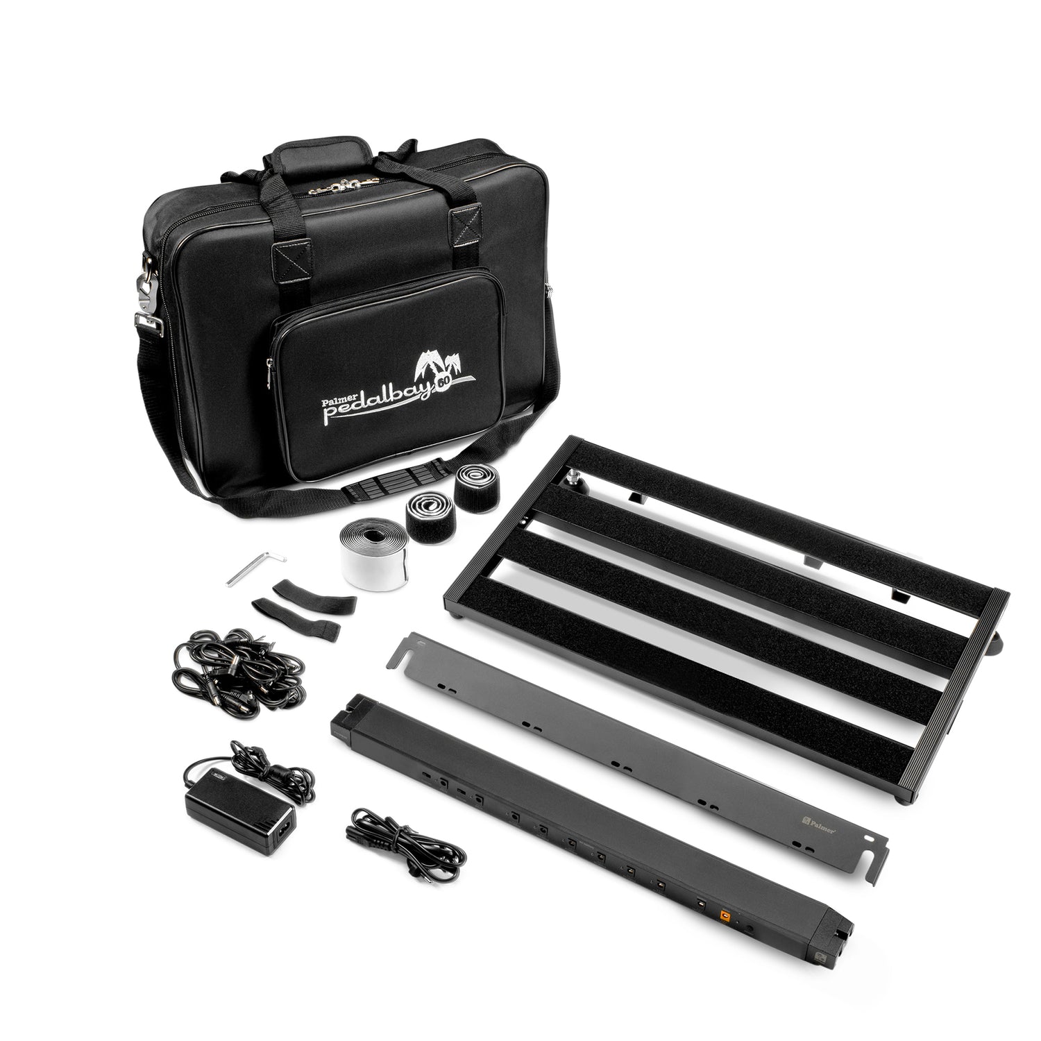 El set PEDALBAY® 60 PB combina Palmer PEDALBAY® 60 y la fuente de alimentación Palmer WT PB 60 con 8 salidas individuales aisladas. Gracias a la integración patentada, la fuente de alimentación puede sustituirse y fijarse mediante el carril trasero del PEDALBAY® 60. Ya no es necesario transportar por separado la fuente de alimentación y el PEDALBAY®.