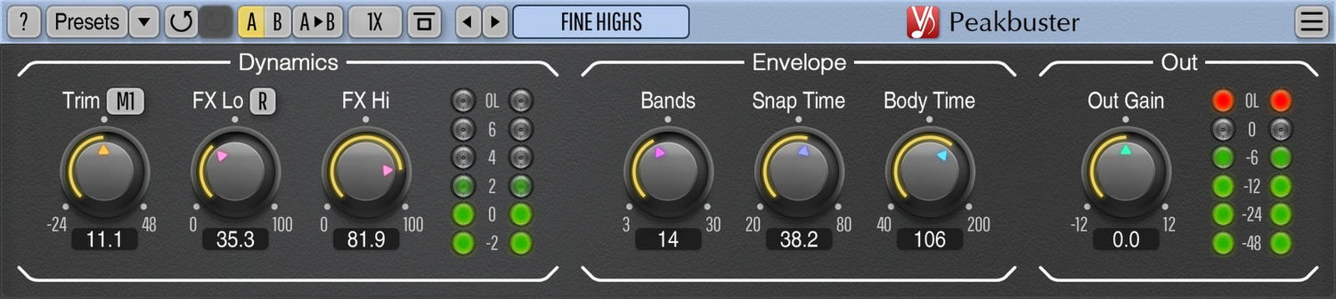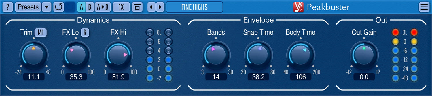 La cantidad de efecto puede seleccionarse de forma independiente para los rangos de frecuencias graves y agudas: esto permite usar Peakbuster con una gran variedad de material, tanto en mezclas completas como en pistas individuales.
