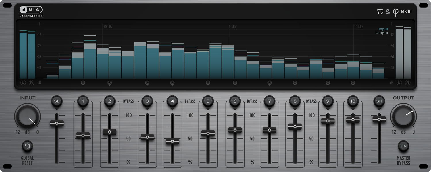Pi & Phi use these harmonious magic numbers to introduce an innovative way of spectral processing. They create an acoustic effect that can be described as “super-enhanced” with a warm yet powerful “sparkle” to it. Pi & Phi MkIII features 10 bands that cover the frequencies from 80 Hz up to 16KHz, along with a “Super Low” and a “Super High” band to cover the extremes of the spectrum.
