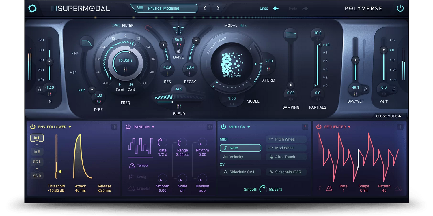Supermodal es un filtro poderoso y único con capacidades de diseño de sonido inigualables que harán que tu música resuene. Remodela pistas ordinarias utilizando su potente filtro Modal que emula características sonoras modeladas a partir de una amplia gama de cuerpos resonantes. Combinado con un filtro de estado-variable en paralelo y un sistema de modulación expansivo, una sola señal de audio puede ser manipulada en una amplia variedad de frecuencias para crear paisajes sonoros cinematográficos brillantes, ritmos pulsantes, pads con movimiento armónico, o cualquier otra cosa que puedas imaginar.