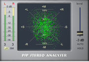 PSP StereoAnalyser se utiliza para medir y estimar la corrección de la señal estéreo. Aparte de la medición media y de pico de los niveles de señal L R o M S, permite la observación en osciloscopio del sonido estéreo, lo que revela errores de fase y falta de equilibrio entre canales.
