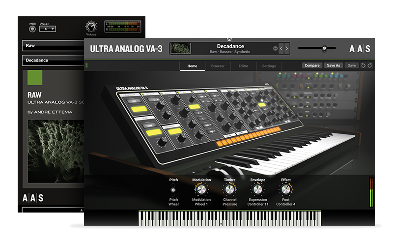 Ultra Analog VA-3 sure can play the bad guy. Raw is a collection of 100 sounds that showcase this lesser-known side of its personality. From subtle warmth to screaming distortion, Raw relies on the natural overdrive of Ultra Analog's filters and its built-in effects to propose a surprisingly varied set of unpolished, gritty, and dirty sounds. Have fun and let yourself go to eleven!
