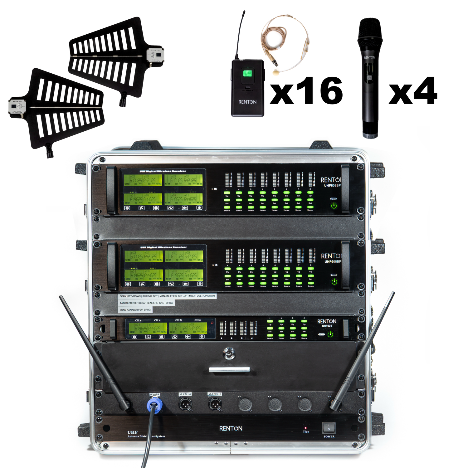 - Dette system har 16 headsets og 8 håndholdte mikrofoner i en praktisk kasse. Lige til at åbne og tillsutte mixer.
