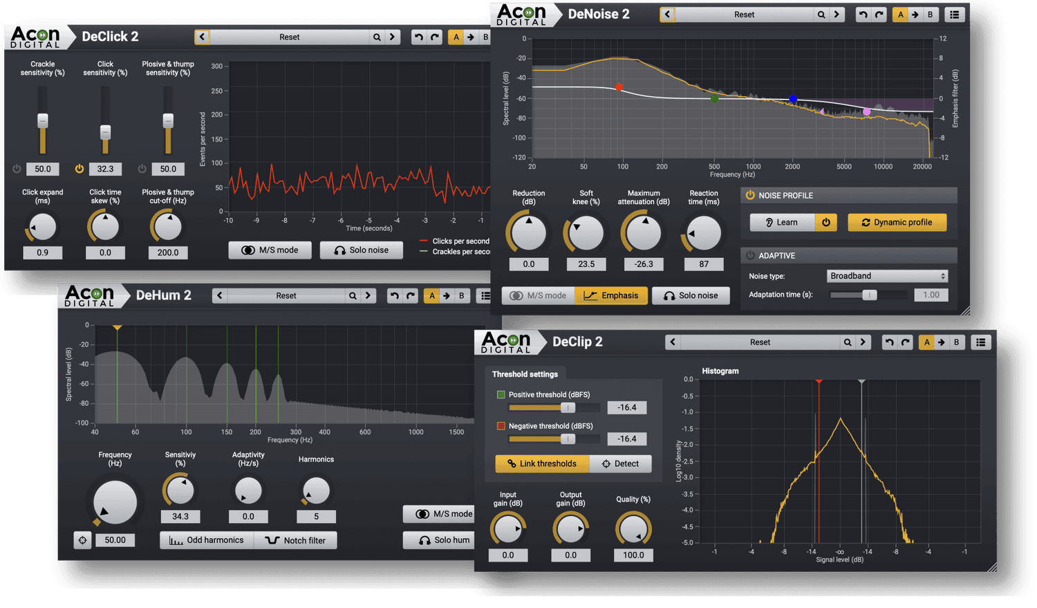 ¡Descubre nuestra Restoration Suite, una colección revolucionaria de cuatro avanzados plugins de restauración de audio diseñados para dar nueva vida a tus grabaciones! Ya sea que estés lidiando con siseos, ruido del viento, zumbidos, clics u otros ruidos no deseados, esta suite tiene lo que necesitas.
