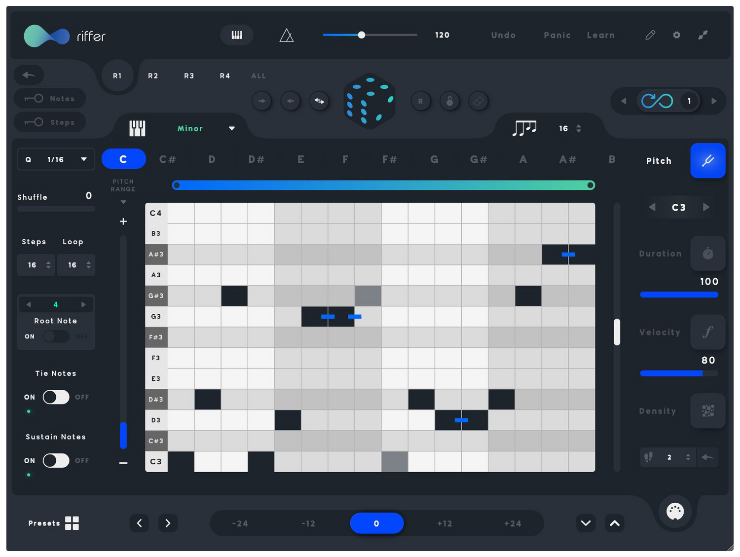 Riffer es una herramienta MIDI inteligente que genera Riffs y Secuencias musicales combinando Pitch, Duration, Velocity y Density. Diseñada para tus sonidos, Software y Hardware. Transfórmalos en algo propio o déjalo funcionar sin fin utilizando el modo de in?finidad.