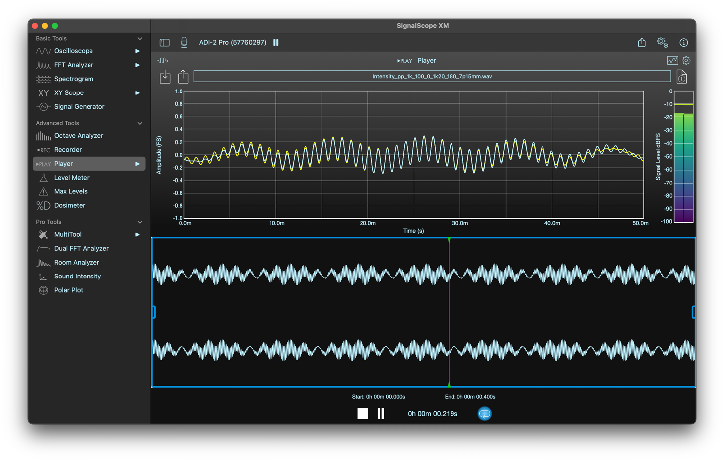 El conjunto de herramientas avanzadas de SignalScope XM incluye acceso a un conjunto de herramientas de análisis básicas y avanzadas, además de soporte de hardware especializado, como la carga automática de sensibilidades de micrófono suministradas por la fábrica para ciertos micrófonos USB, sensibilidades de voltaje nominal actualizadas para ciertos dispositivos de entrada de audio y calibración automática para dispositivos de entrada de audio que incluyen información de sensibilidad incorporada.
