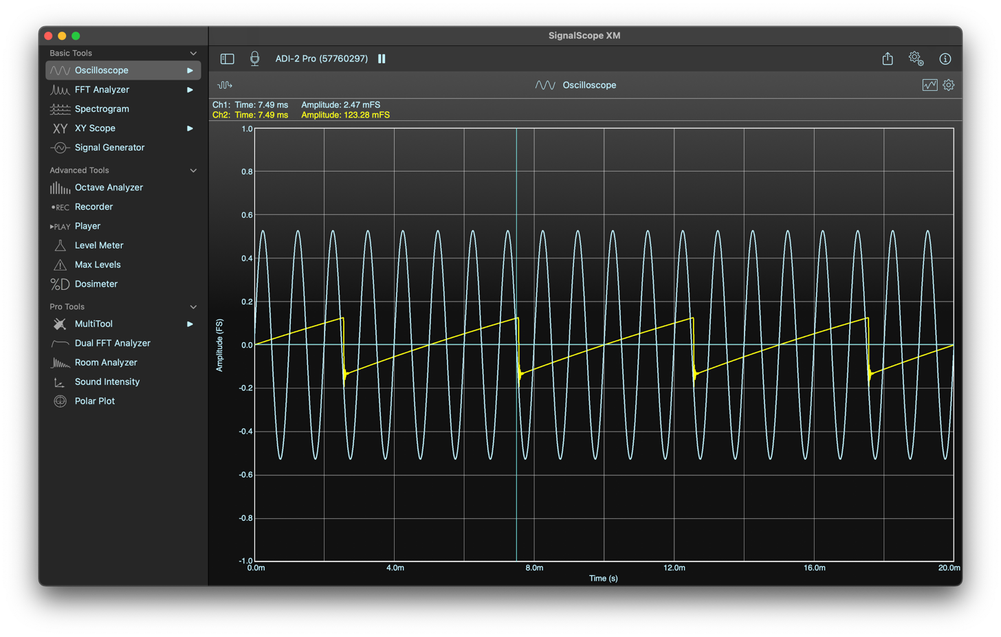 El conjunto de herramientas básicas de SignalScope XM incluye acceso a un conjunto de herramientas de análisis básicas, además de soporte de hardware especializado, como la carga automática de sensibilidades de micrófono suministradas por la fábrica para micrófonos USB seleccionados, sensibilidades de voltaje nominal actualizadas para dispositivos de entrada de audio seleccionados y calibración automática para dispositivos de entrada de audio que incluyen información de sensibilidad incorporada.