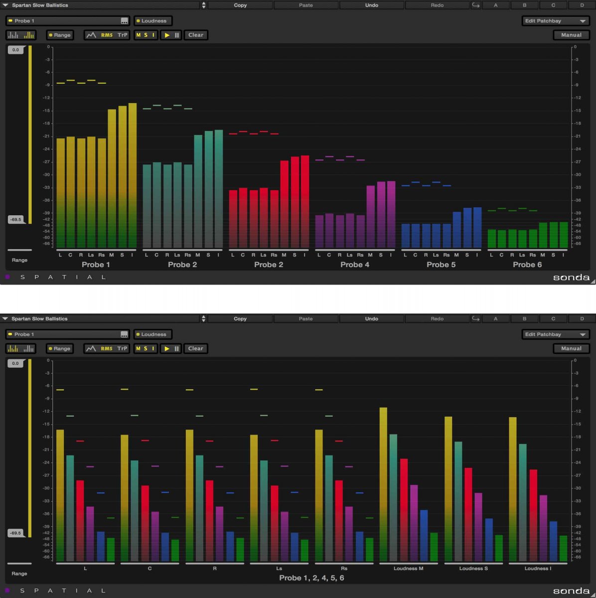 DSpatial Sonda es un medidor de nivel multipunto. Ofrece lecturas de peak, RMS y loudness, y permite comparar varios puntos dentro de una mezcla compleja desde una sola interfaz.