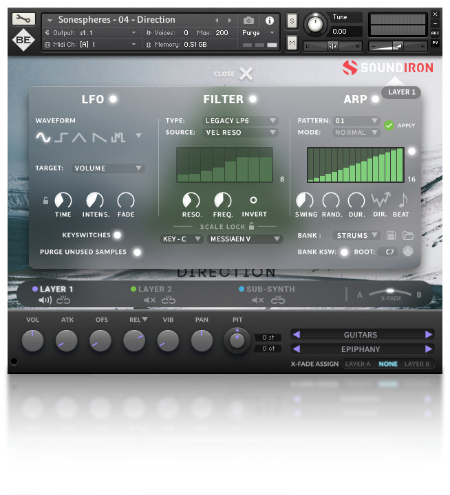Esta biblioteca viene con un sistema LFO adaptable, con forma de LFO seleccionable, parámetro objetivo de modulación, velocidad, intensidad, sincronización de tempo y tiempo de desvanecimiento. También puedes aplicar tu elección de 12 filtros de paso bajo, paso alto y FX, con objetivos de modulación asignables como velocidad, modwheel, expresión, after-touch, posición de tecla y control de tabla de secuenciador por pasos. Nuestro arpegiador personalizable ofrece una tabla de velocidad y control sobre la dirección del arp, el tiempo, el swing, la aleatorización y la duración. Hemos incluido un sistema de bloqueo de clave y escala para restringir tus notas a escalas y claves comunes para una composición melódica fácil y una actuación en vivo.