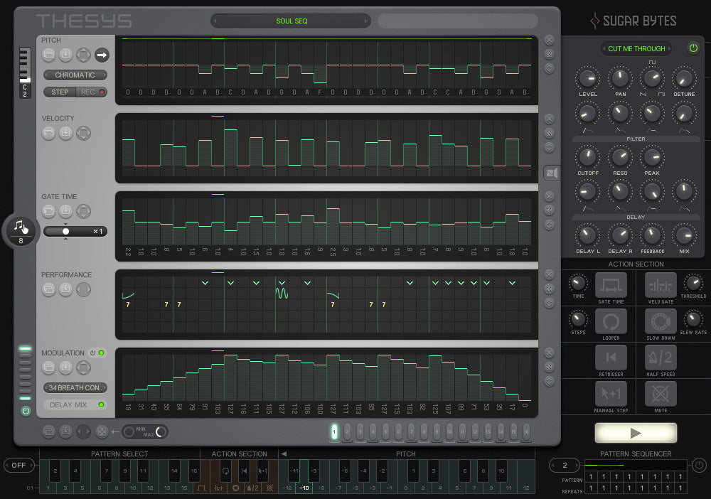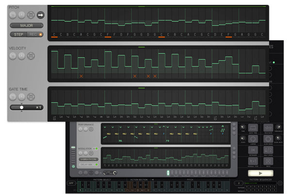 Debajo de la pista de tono, verás la Velocidad (volumen) y el Secuenciador de Gate (controlando la longitud de cada nota). Es en estas tres secciones principales donde pasarás la mayor parte de tu tiempo, programando riffs y arpegios, y luego asignándolos a patrones.