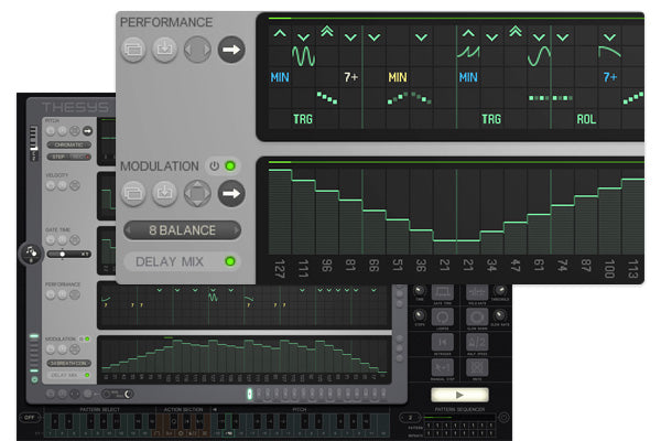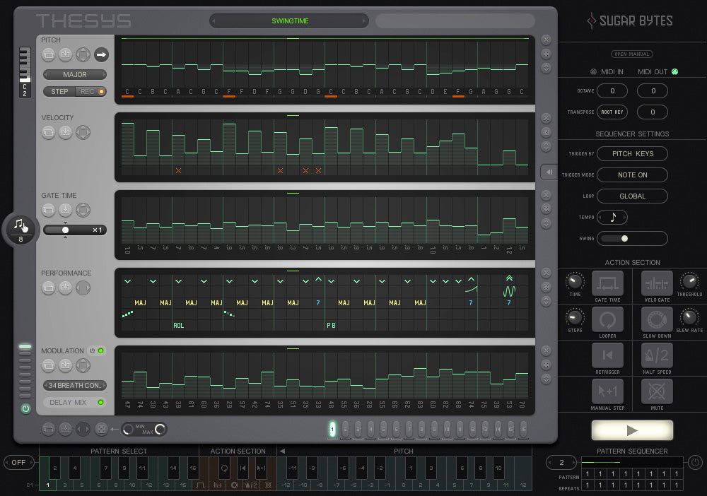 Se pueden crear hasta 16 patrones completos dentro de un solo proyecto. Pueden ser secuenciados dentro del Secuenciador de Patrones (abajo a la derecha) o activados a través del Teclado (configurado en "Tono"), donde se utiliza toda la longitud del teclado para transponer el patrón actual. Cambia a "Rendimiento" y el teclado se divide en 3 zonas: Selección de Patrón, Sección de Acción y un Rango para transposición de tono.