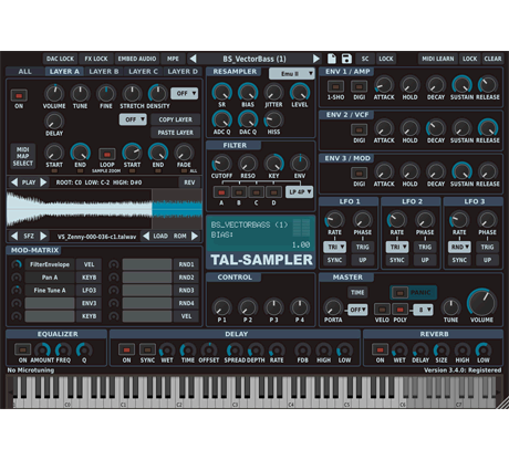 TAL-Sampler no es solo un reproductor de muestras. Es un sintetizador modelado analógicamente con un motor de muestreo como fuente de sonido, que incluye una potente matriz de modulación y filtros auto-oscilantes de alta calidad.