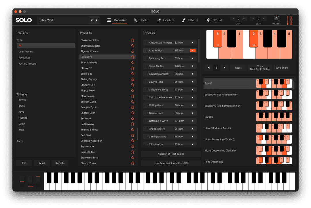 Ve más allá de los confines de la escala de doce tonos con el intuitivo conversor de escalas “estilo oriental” de SOLO. Explora una extensa biblioteca de escalas microtonales, capturando las ricas tradiciones musicales de Oriente Medio y más allá.