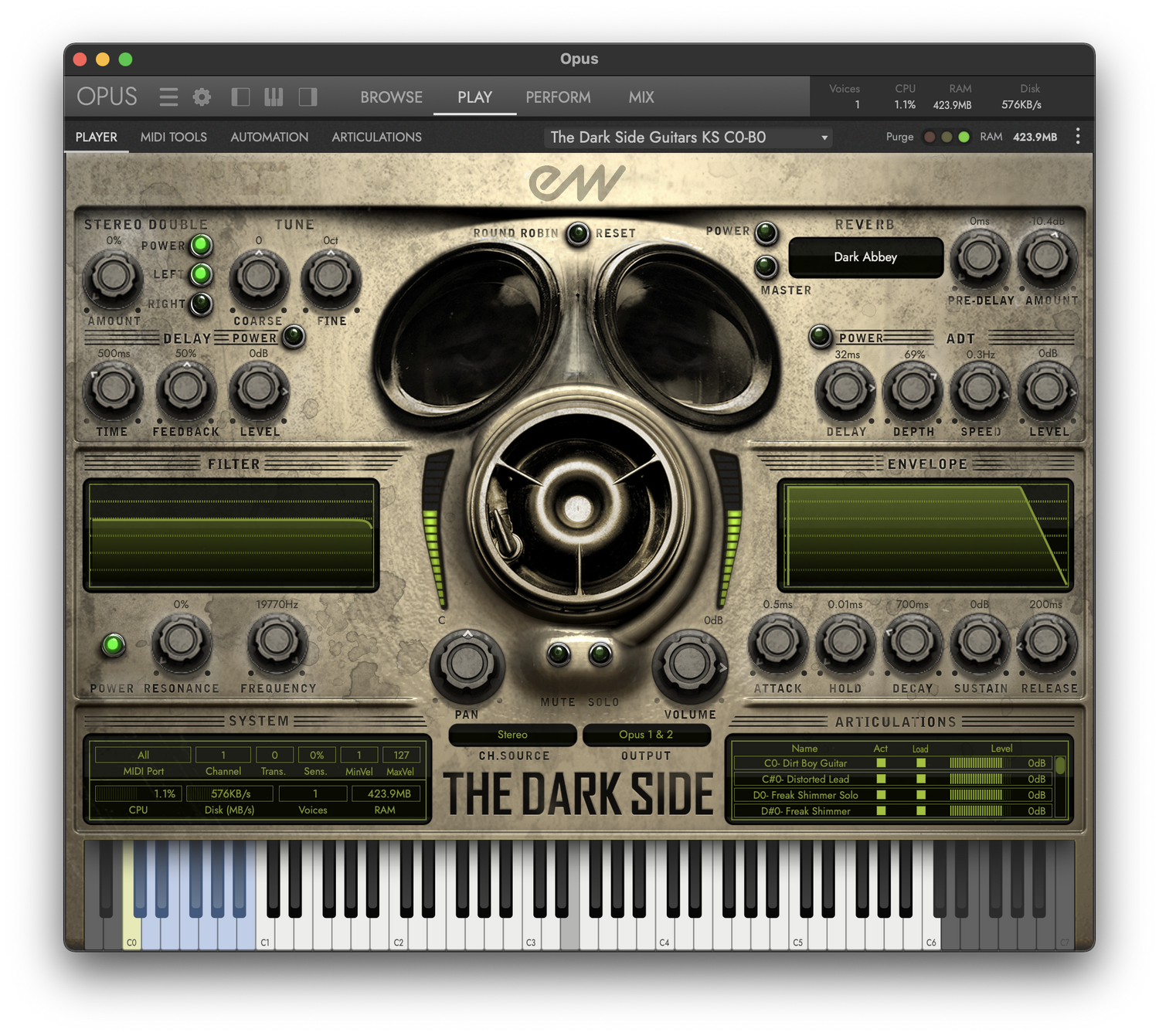 THE DARK SIDE incluye una vasta colección de 40 Gigabytes, que incluye instrumentos oscuros y espeluznantes, y tambores y percusiones altamente procesados, bajos, guitarras, instrumentos étnicos, de teclado, cuerdas e instrumentos procesados, todos organizados en grupos instrumentales para que puedas crear pistas completas.