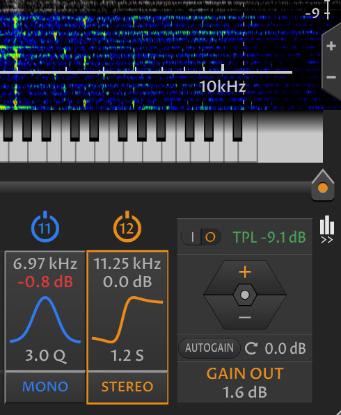 - Twelve Sections with eight freely assignable parametric filter types: classic bell, high or low shelf, high or low cut as well as VariSlope high or low shelf, and high or low cut