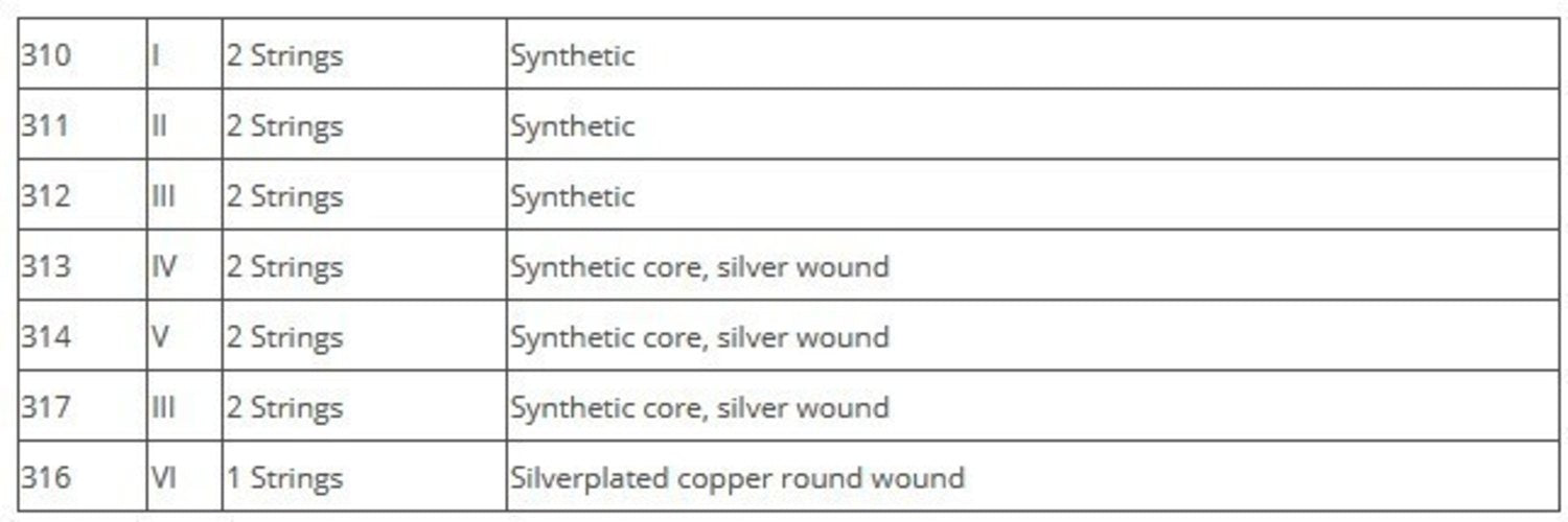 - 11-string set with D String wound (2 each of x 310, 311, 317, 313, 314, 1 x 316)