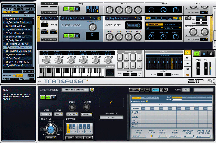 Transfuser 2 also acts as an inspiring compositional tool that intelligently generates chords, melodies, variations, and grooves based on a musical analysis of your track. Plus, Transfuser 2 comes with a premium drum and instrument library that includes 3,200+ loops and 1200+ drum machine samples for instant music experimentation.