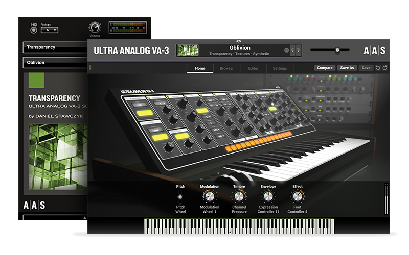 Transparency is sound designer Daniel Stawczyk’s fourth title in our Sound Bank Series and his third for Ultra Analog VA-3. The 149 rich presets explore the percussive nature of our analog synthesizer. Kick, Snare, Hi-hat, and Percussion loops are bundled along with some finely crafted Ambient, Synth, and Effect sounds.