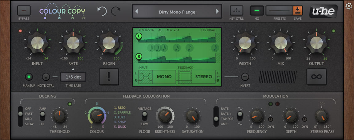 A algunas personas les gusta actuar en su hardware BBD, ajustando la regeneración hacia arriba y hacia abajo al girar el knob de tasa. Llevamos Colour Copy un paso más allá en esta dirección al agregar un par de características creativas: Primero, un botón de congelar que repite el contenido del buffer de delay durante el tiempo que desees. En segundo lugar, control de clave MIDI para que puedas tocar Colour Copy como un sintetizador mono – cada octava hacia arriba duplica la tasa de delay.