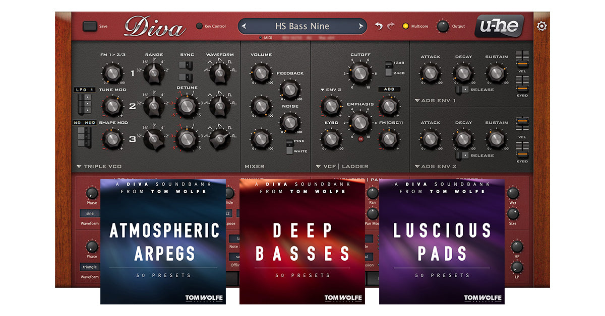 Este paquete incluye tres bancos de sonido elaborados por el renombrado diseñador de sonido Tom Wolfe: Luscious Pads, Atmospheric Arpegs y Deep Basses, cada uno con 50 presets que muestran la destreza analógica de Diva. Desde texturas suaves y cinematográficas hasta líneas de bajo audaces y arpegios dinámicos, esta colección ofrece inspiración instantánea para compositores de medios y productores electrónicos por igual.