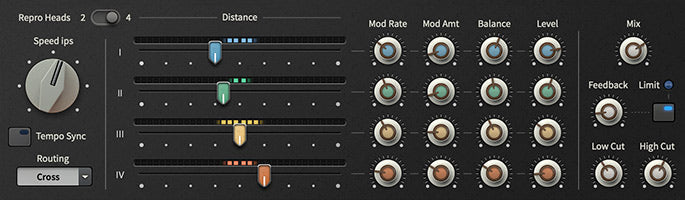- Stereo delay mode (2 or 4 heads) with multiple-mono, cross or ping-pong routing