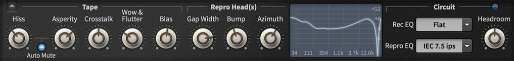 En la sección de Cinta están quizás los atributos más fácilmente identificables de la grabación en cinta: siseo, aspereza, wow & flutter, crosstalk y bias. Marca un poco de cada uno para una vibra retro o “pegar”. Marca los ajustes extremos y puedes terminar con el sonido de una cinta de mala calidad dejada en el sótano de alguien demasiado tiempo.