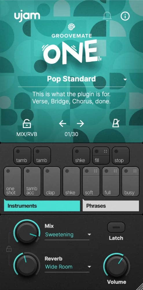 Groovemate ONE rápidamente y fácilmente añade sabor a tus pistas con esa sensación importante. Simplemente selecciona una de las frases predefinidas y ajústalas a tus necesidades. O toca los instrumentos contenidos tú mismo, directamente a través de la entrada MIDI.