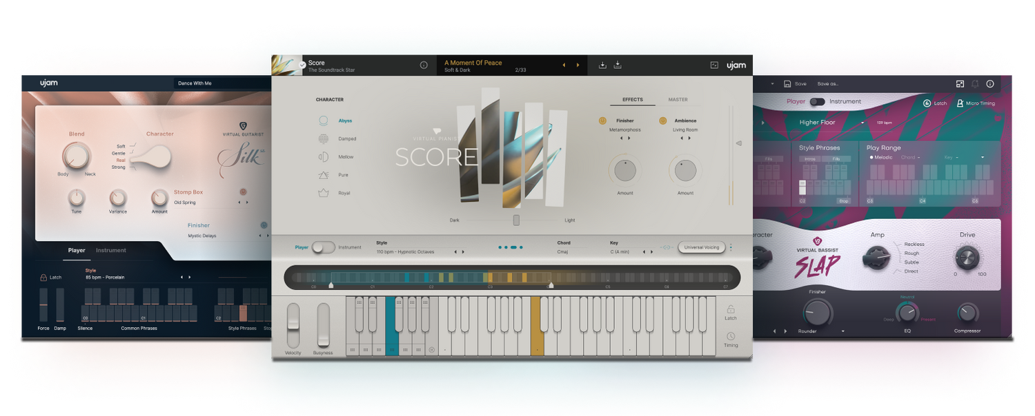 Virtual Pianist SCORE ofrece actuaciones de piano cinematográficas, mientras que Virtual Guitarist SILK 2 interpreta partes de guitarra acústica con sonido profesional. Agrega energía con los estilos dinámicos de funk de Virtual Bassist SLAP.