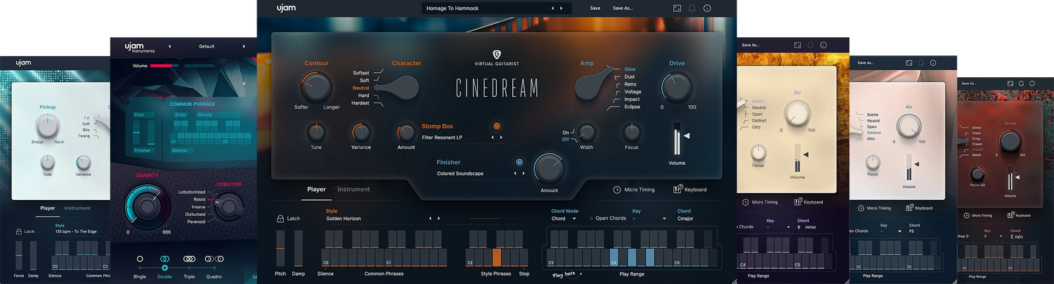 El secreto detrás de la serie Virtual Guitarist radica en la política de diseño sin frustraciones de UJAM: ¡no se necesitan habilidades de ingeniería de sonido ni de guitarra! Simplemente inserta el plugin de instrumento virtual en tu DAW compatible y comienza a producir pistas de guitarra con sonido realista al instante utilizando controles intuitivos.