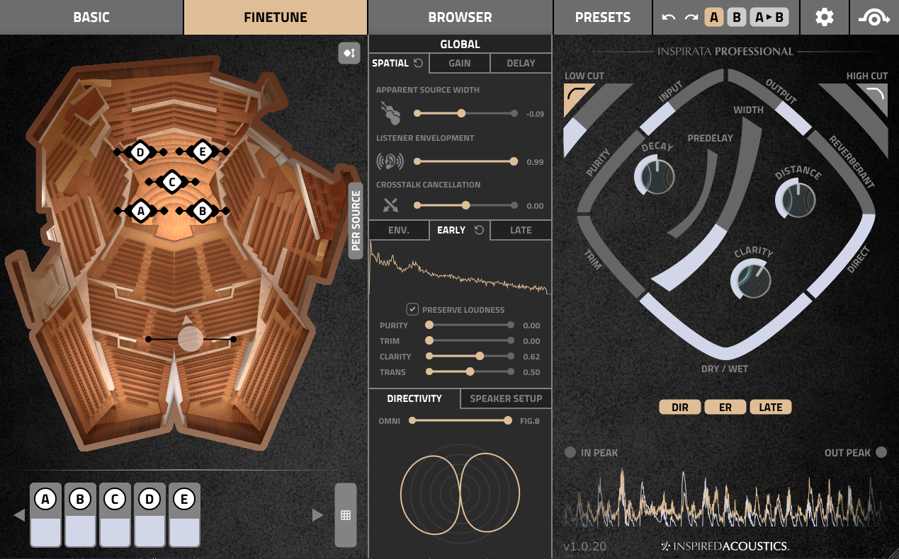 En INSPIRATA, hacemos posible que controles parámetros que realmente importan a tus oídos; puedes ajustar directamente la acústica y el sonido del espacio en lugar de las propiedades indirectas que no cambian el sonido. Ha pasado el tiempo en que necesitabas preocuparte por el tamaño del salón, la difusión de las paredes o la decorrelación solo para obtener diferentes resultados en cada espacio. Ahora tienes control total e independiente sobre cuán amplia es tu fuente de sonido en el espacio, cuánto del sonido mezclado te llega y cuánto te envuelve alrededor de las orejas. Los parámetros acústicos espaciales de la sala, como el ancho aparente de la fuente de sonido (ASW) y la envoltura del oyente (LEV), son controlables por primera vez directamente en cualquier solución de reverberación. Además de estos controles revolucionarios, también puedes ajustar la orientación de tus salidas de altavoces en el espacio, orientando tu configuración estéreo o envolvente en cualquier dirección. Y puedes cambiar y automatizar todo esto en tiempo real.