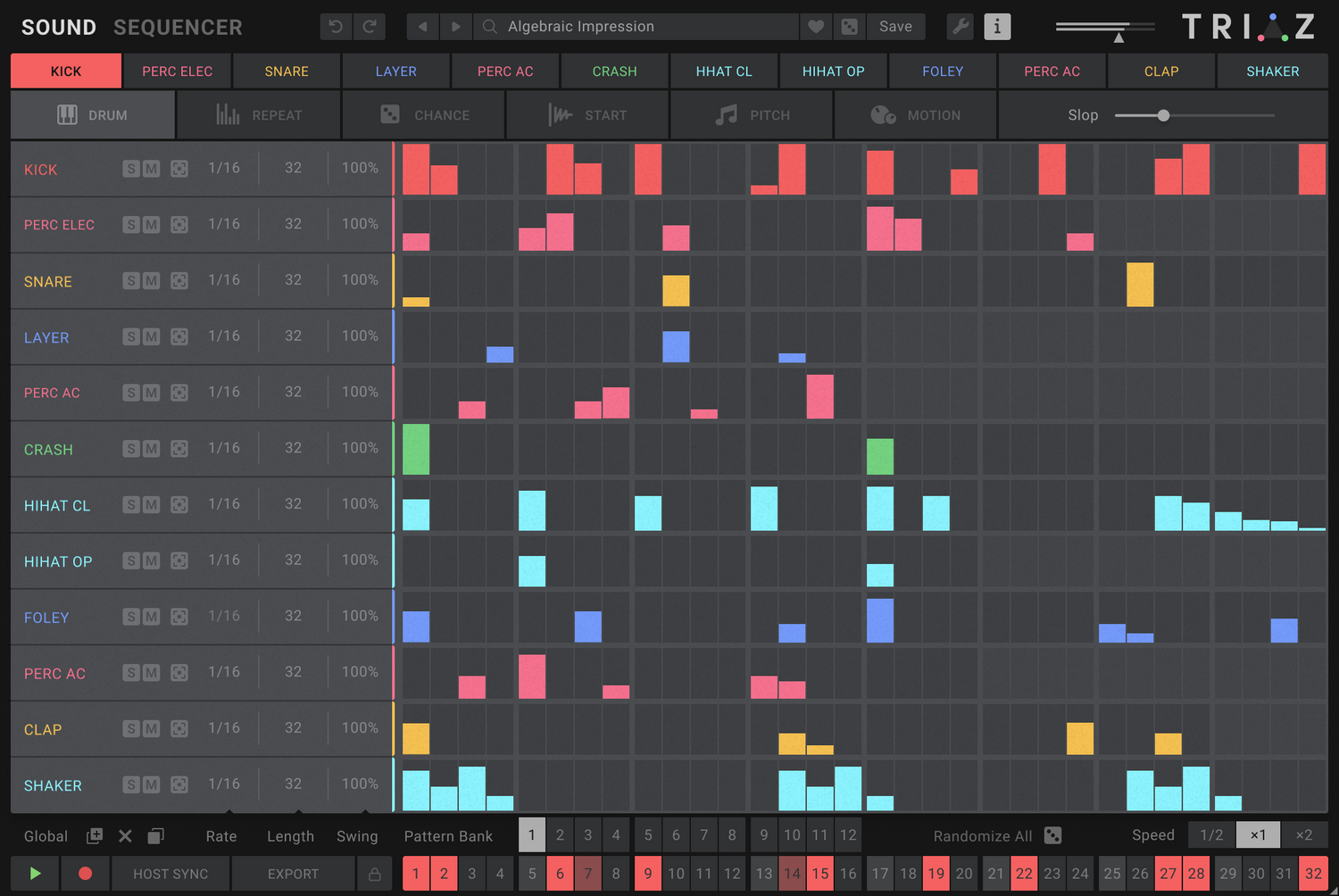 El secuenciador visual por pasos de Triaz es un parque de diversiones creativo, permitiéndote construir grooves que se mueven y evolucionan: