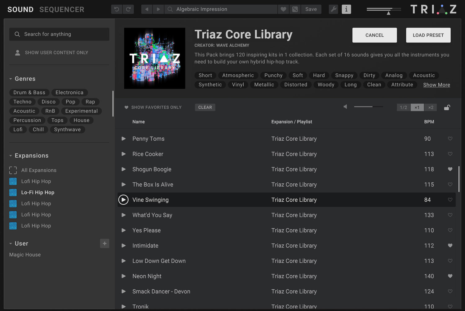 - Marca favoritos, previsualiza sonidos instantáneamente y navega por las expansiones de Triaz