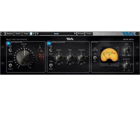 Tube Saturator 2 es una simulación de circuito super precisa de un preamplificador de válvula con EQ analógico, que se puede sobrecargar suavemente para efectos de calidez, o aumentar para una distorsión gruesa. Al igual que su predecesor, Tube Saturator Vintage, TS-2 se basa en tecnología de simulación de circuitos para capturar cada matiz de un circuito analógico. El circuito que consiste en los tubos individuales, resistencias y capacitores se convierte en un sistema matemático de ecuaciones que se resuelve numéricamente para producir el mismo sonido exacto que un circuito real. Pero mientras que el original consumía grandes cantidades de potencia de CPU para calcular las soluciones en tiempo real, TS-2 utiliza grandes tablas de soluciones precomputadas. La sección de Saturación de TS-2 funciona aproximadamente 7 veces más rápido que el original y, sin embargo, la modelación es aún más precisa. TS-2 incluye la simulación de circuito original del EQ tipo Baxandall de tres bandas como se encuentra en muchos amplificadores de guitarra.