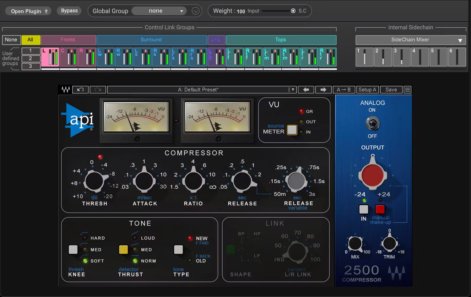 Ahora puedes crear configuraciones de procesamiento de buses inmersivos en mezclas multicanal / basadas en objetos, utilizando tus plugins favoritos de Waves—completos con un sistema de sidechain interno compartido para el procesamiento dinámico en toda la mezcla.