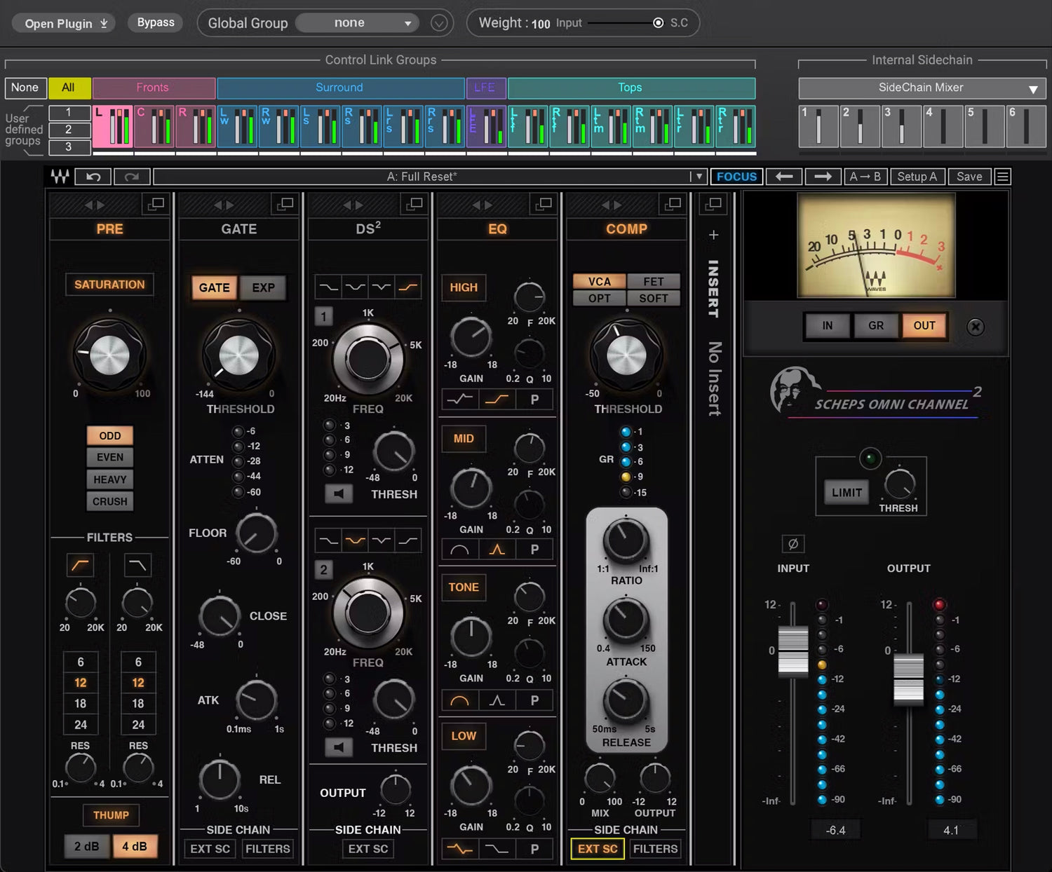 - Comprehensive shared internal sidechain system, for mix-wide dynamics processing