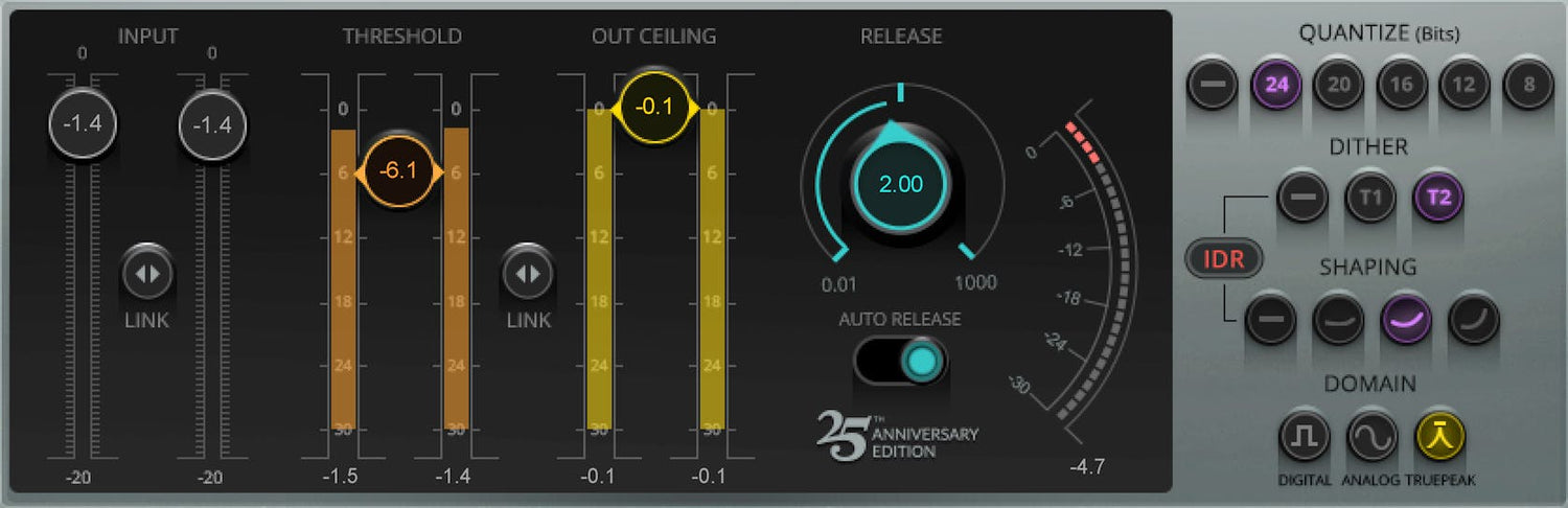 Transparente y contundente, L1 ofrece limitación de picos verdadera que elimina el clipping inter-sample. Maximiza tanto el nivel de la señal digital como la resolución del archivo final. Ofrece una re-cuantización excepcional para todas las profundidades de bits. Su limitador de picos con anticipación te permite aumentar la resolución del archivo de sonido y los niveles de masterización de producción con control preciso y opciones de dithering.